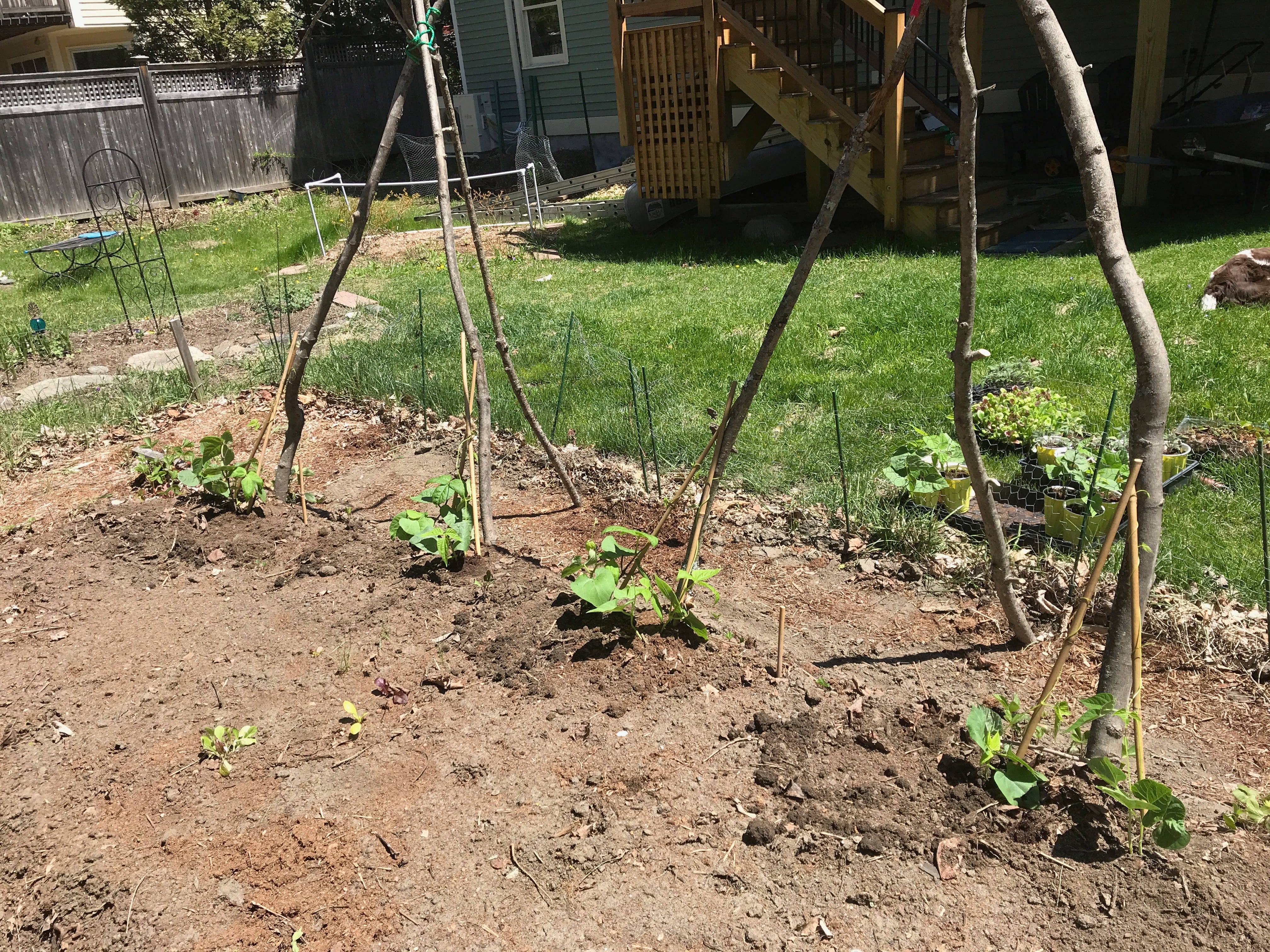 We decided to plant pole beans in our garden one year and set up four poles for them to climb. The plan was to send two bean plants up each pole. We’d started the plants indoors so we knew we had eight good plants.