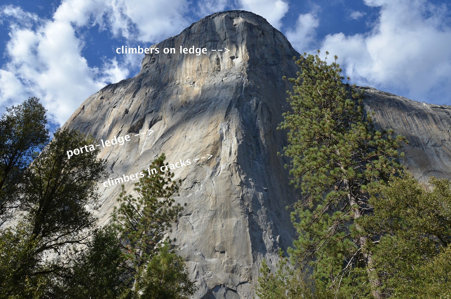 Climbing notes — rock climbing is the sport of climbing rock walls, as distinct from mountains. Aid climbing is climbing a cliff using a combination of hands, feet, and devices attached to the rock, often driven in small cracks or sometimes bolted to the rock. Free climbing is climbing using only the hands and feet to move up, but using ropes and carabiners and belayers and all that for safety in case of a fall, which is likely when pushing higher standards. Rock climbs are often first climbed using aid and then later climbed without, so you’ll see a climb have a credit for first ascent and then first free ascent.